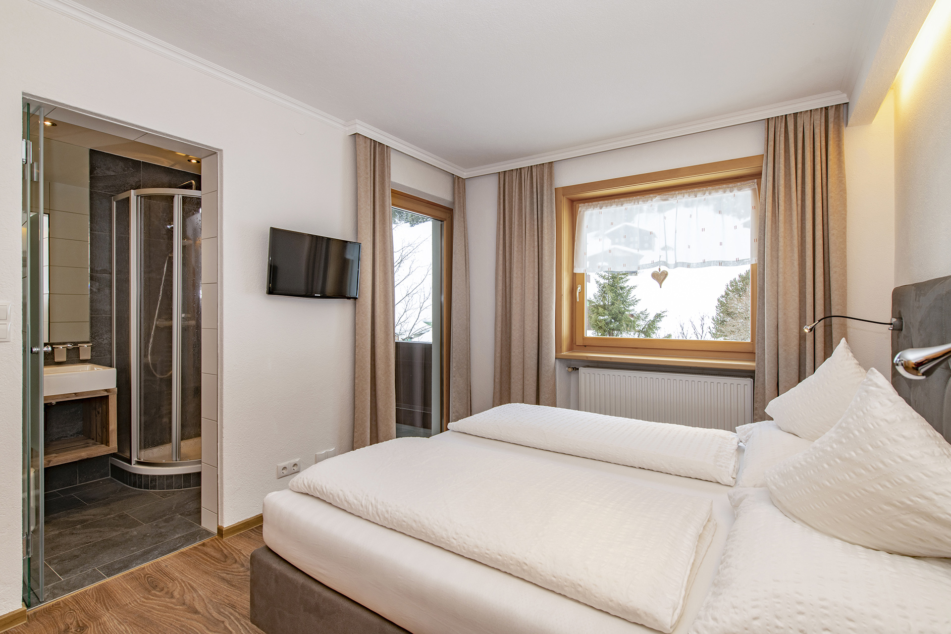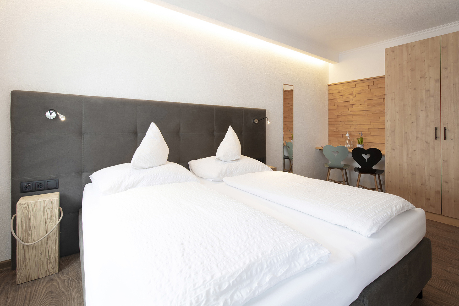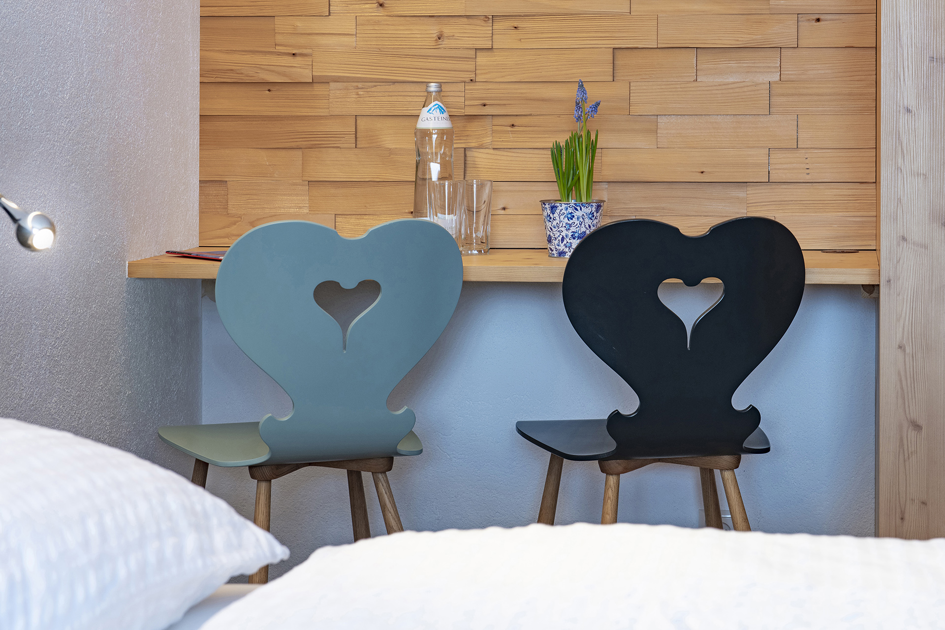 Du bevorzugst es schlicht, aber trotzdem gemütlich? Dann ist unser Zimmer 6 genau das Richtige für dich. Es bietet entweder ein Doppelbett oder zwei Einzelbetten, einen Schreibtisch und einen Schrank. Das Badezimmer ist kompakt, aber ausgestattet mit einer erfrischenden Regendusche, Shampoo, Seife, Haartrockner und WC. Ein Balkon mit herrlichem Bergblick sorgt für das besondere Extra. Und natürlich gibt es auch einen schnellen WLAN-Empfang.